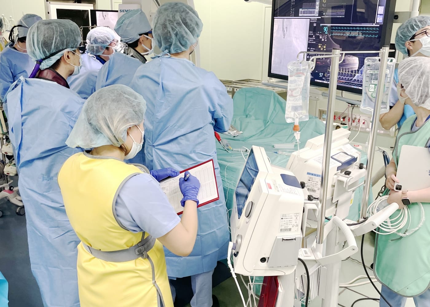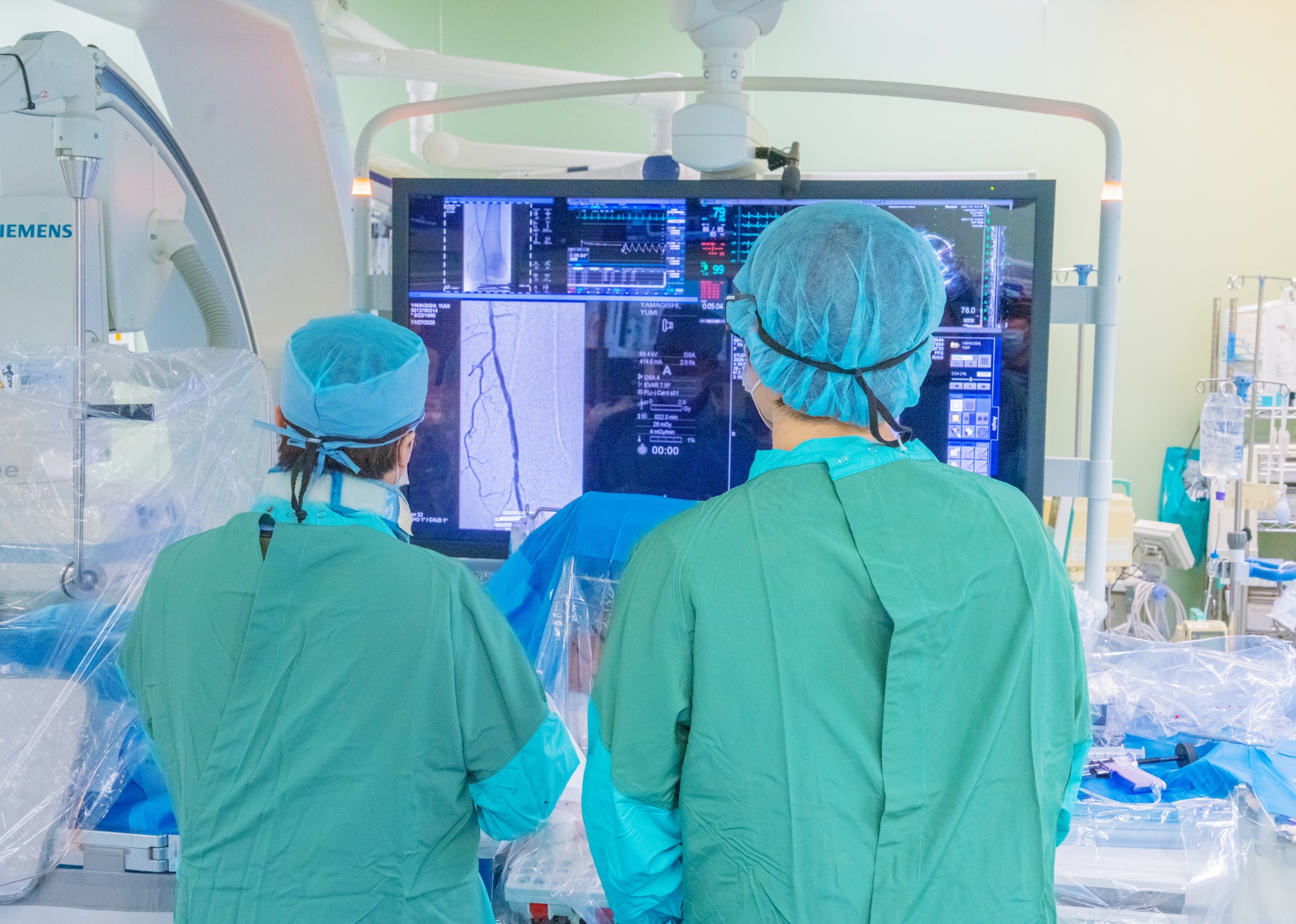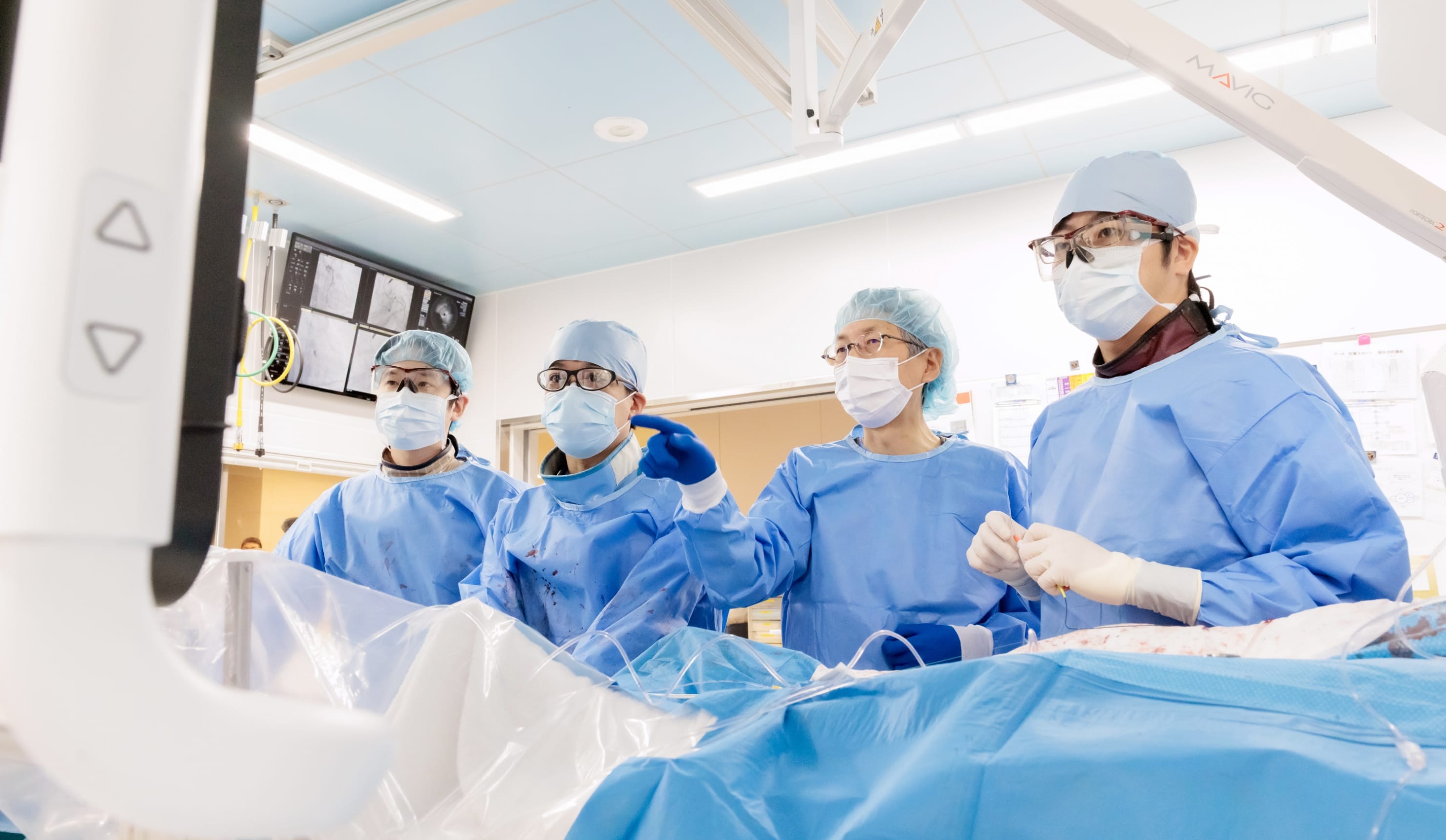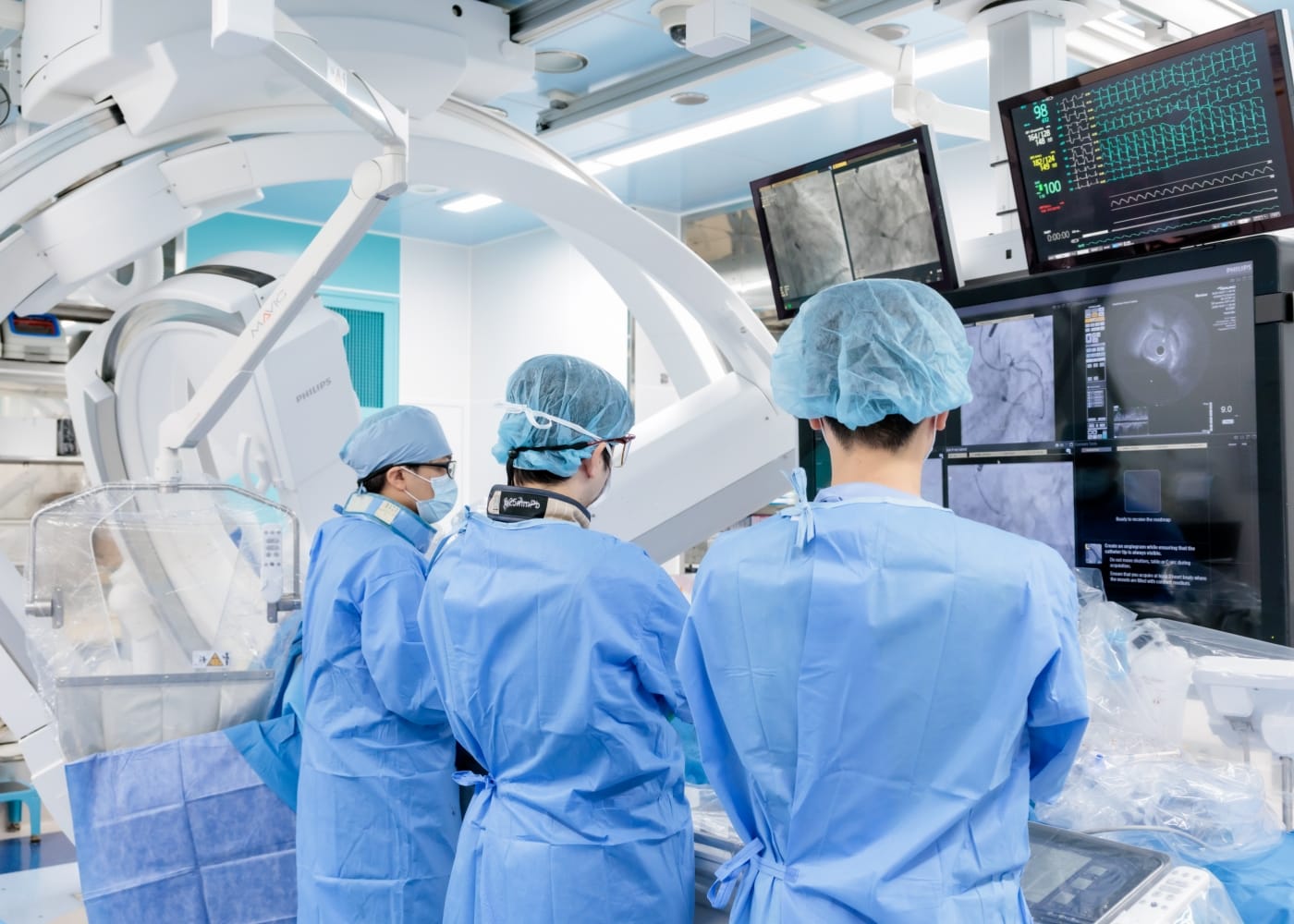 当院では、救急搬送される急性心筋梗塞や弁膜症による重症心不全を数多く受け入れ、24時間365日、緊急カテーテル治療を受けられる体制を整えています。必要に応じて、Impella・IABP・ECMOなどの補助循環を組み合わせ、全身の血流を保ちながら心臓の回復をサポートします。多職種からなるチームスタッフが連携し、安心して治療を受けられる体制を整えています。