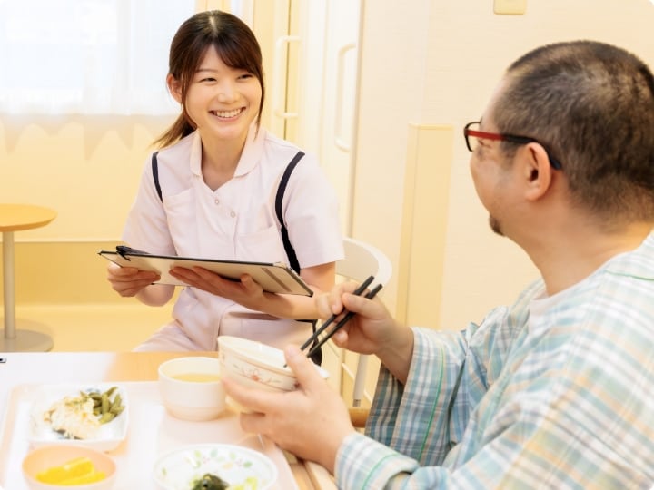 毎日のお食事は、医師・管理栄養士が検食を行い、また患者さんへ量や味付け、硬さ、盛り付け、温度、献立内容などの嗜好調査をアンケートにてお伺いしています。お食事の内容を総合的に検証しながら、多くの患者さんに満足いただけるよう、質の向上に努めています。