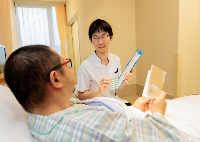 患者さんが入院されたらまず、処方薬や副作用・アレルギー、ご自宅での内服状況について確認させて頂きます。そして患者さんから得た薬の情報と検査データなどカルテの情報をもとに、医師へ処方提案を行います。入院中は薬の効果・副作用のチェックをし、退院に向けて服薬指導を行っています。