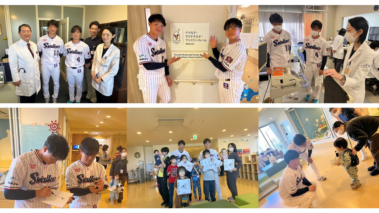 選手の皆様は、日々トレーニングをし、時にリハビリをしながら、小さいころから野球を続けて、今日に至っているようです。心臓病の治療および心臓リハビリテーションについて等、榊原記念病院の医療への取り組みを学ばせていただきたいと訪問されました。また、小児病棟、マクドナルドファミリールームも訪問され、握手会、記念撮影会など快くお引き受けいただき、小児病棟の入院中の子どもたちに元気を届けていただきました。