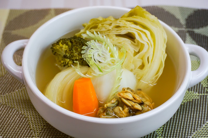 炊飯器で出来る具沢山のスープです。具材には、鉄分を多く含むあさりと葉酸を多く含むブロッコリー、キャベツ、かぶの葉を使用しました。カレー粉を使う事で薄味ですが美味しく食べられます。