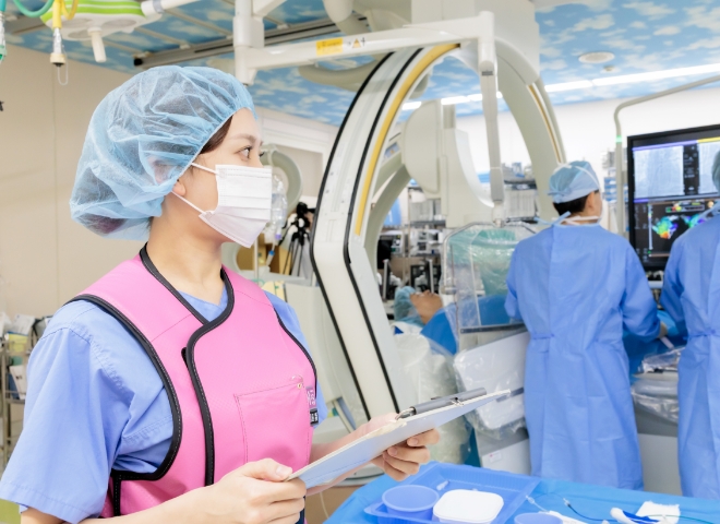 心臓カテーテル室では、冠動脈疾患や不整脈、構造的心疾患に対する検査・治療を安全・低侵襲で行っています。医師、臨床工学技士、放射線技師らと密に連携し、看護師はチームの要として安全管理と患者支援を担います。高度医療の現場で専門性を磨き、多職種と協働して質の高い心臓治療を提供する職場です。