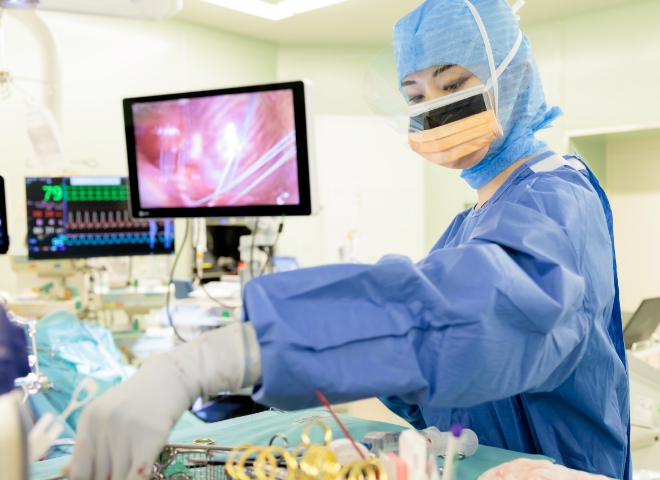 手術室では、開心術から低侵襲手術まで幅広い心臓外科手術を実施。熟練の外科医、麻酔科医、看護師が協力し、安全・確実な手術を行います。最新設備を整え、患者さんの体への負担軽減と手術成績向上に取り組んでいます。