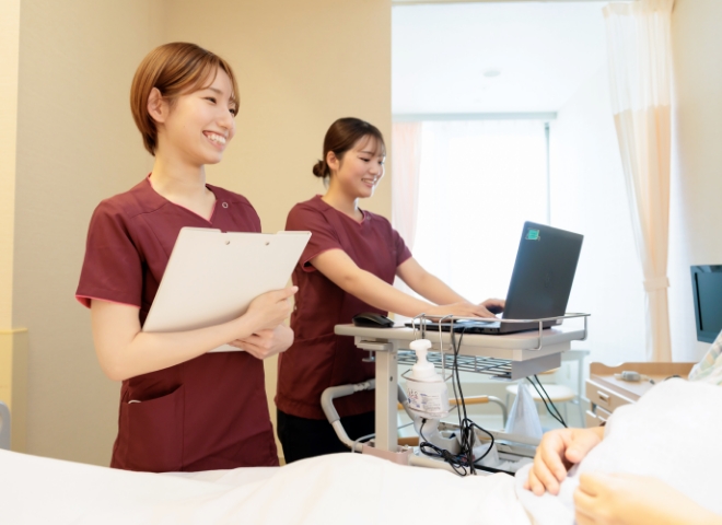 看護部では、循環器看護の高度な専門性を基盤に、患者さんの人生に深く関わるケアを大切にし、思いやりと確かな技術で「その人らしさ」を支えています。