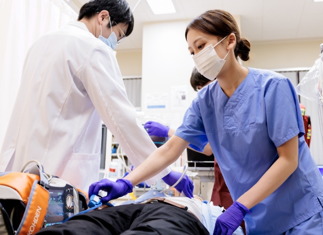 救急外来は、都内最多の循環器救急に対応する最前線の部門です。心筋梗塞など一刻を争う緊急症例に対し、初期評価から治療方針決定までを迅速に行い、カテーテル室と密に連携して治療開始時間の短縮を実現しています。看護師は高度な観察力と判断力を発揮し、多職種と協力しながら、命をつなぐ初療を支える重要な役割を担います。