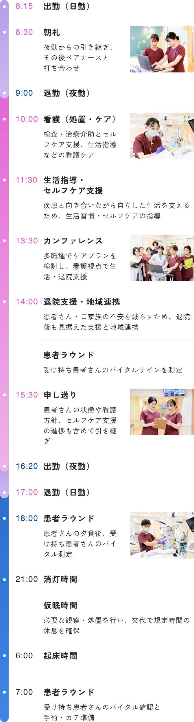 当院では2交代制を採用しており、日勤から夜勤へと無理のないシフトを基本としています。